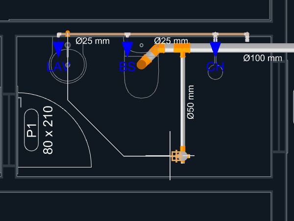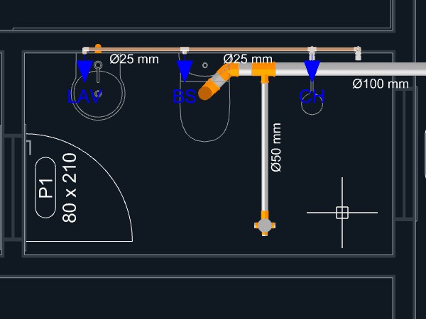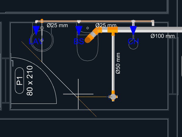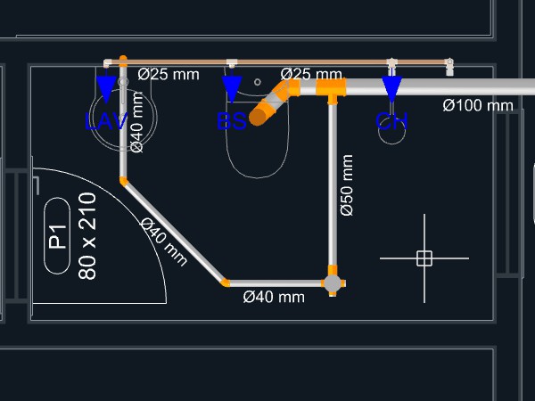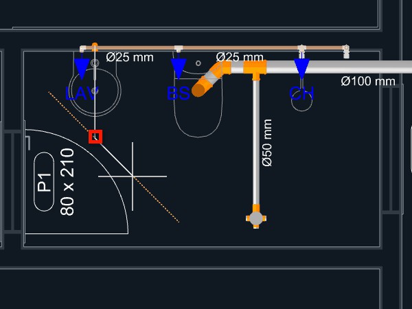 Clique sobre o triângulo laranja no ponto central do aparelho, onde se localiza a saída para o esgoto sanitário, para dar início ao lançamento da tubulação;