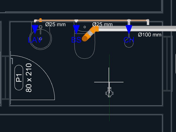 Observação: Quando uma tubulação de esgoto é iniciada a partir de um aparelho com a direção de saída apontando para o piso, um ponto será adicionado automaticamente levando a tubulação para o nível abaixo do piso.