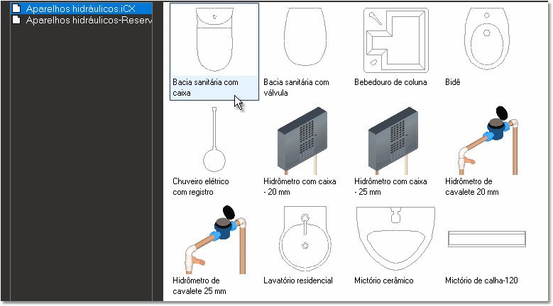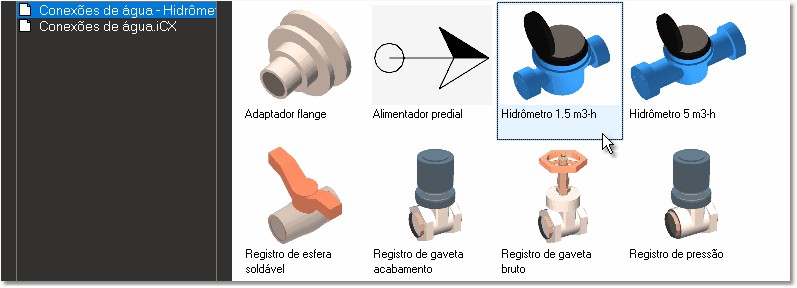 3. Na coleção de "Aparelhos hidráulicos", selecione o componente "Hidrômetro com caixa 25 mm" ou o hidrômetro de sua escolha para o projeto e pressione OK para confirmar;
