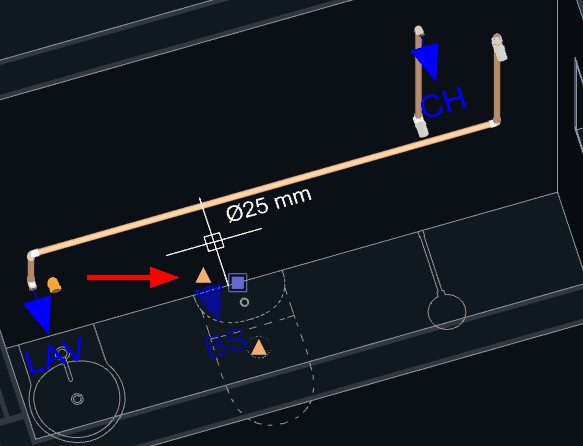 14.  Aproxime o cursor do mouse da parte da tubulação lançada anteriormente entre o Lavatório e o Registro;