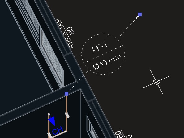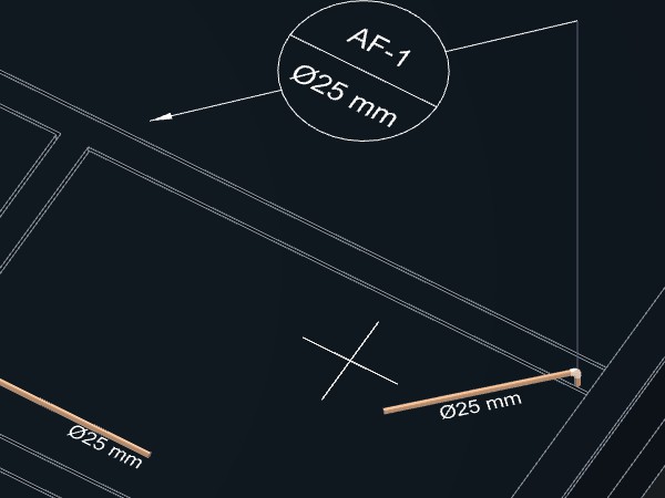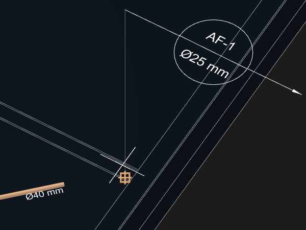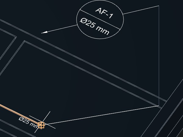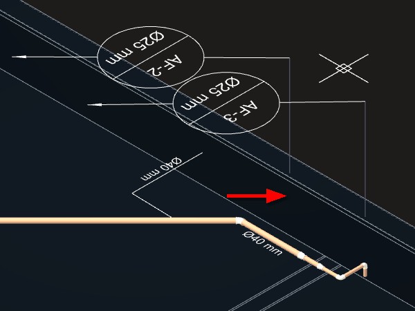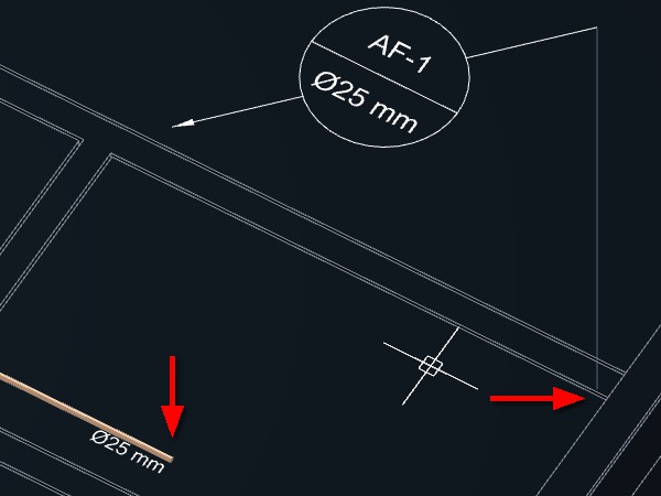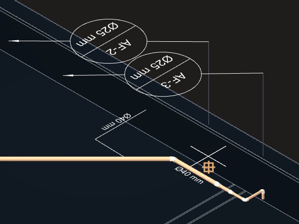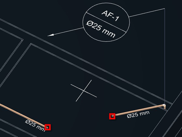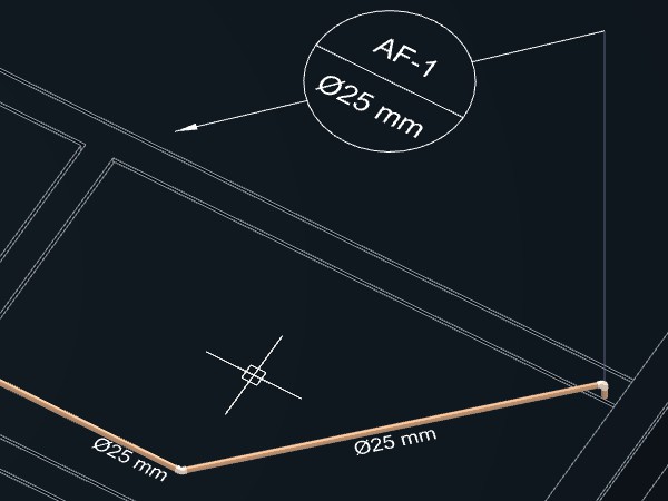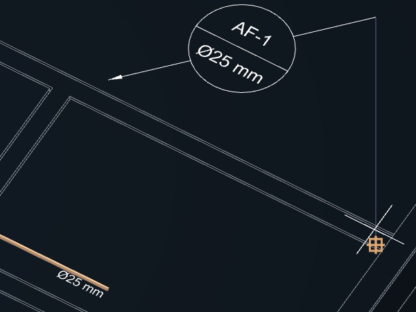 Caso indique um ponto próximo da tubulação, a indicação será desenhada acompanhando o ângulo do trecho da tubulação no ponto indicado. Se o ponto for a uma certa distância da tubulação, será criada uma linha de chamada para a indicação.
