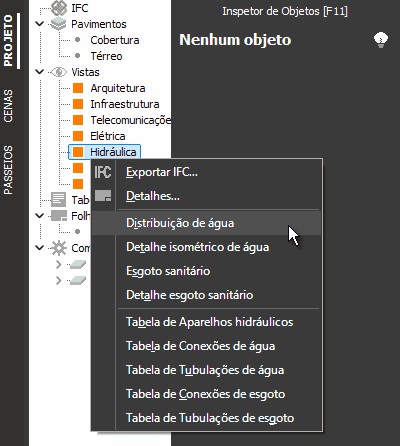 A definição de planta de Distribuição de água deverá ser criada e aparecer na relação de itens do Gerenciador de projetos.