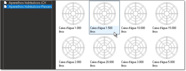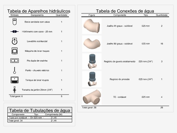 Já estão configuradas tabelas com símbolos e quantidades para Aparelhos hidráulicos, Tubulações e Conexões de água.