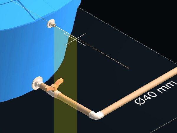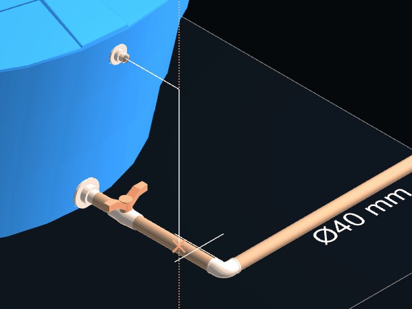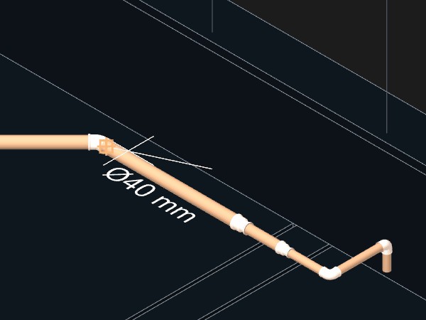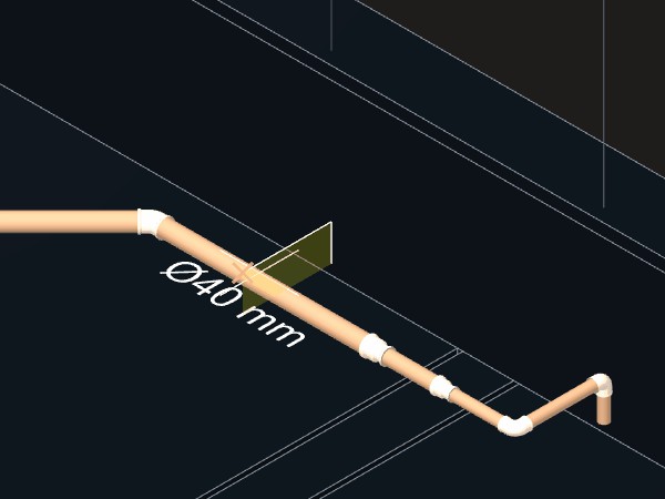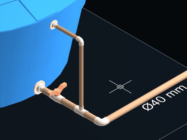 A tubulação deverá ser divida em duas partes e no local será criado automaticamente um Tê de redução 40 x 25 mm para ligar as tubulações e outras conexões necessárias se estiverem disponíveis no projeto ou na biblioteca de componentes. Utilize os mesmos procedimentos descritos acima para criar as tubulações de limpeza e do extravazor.