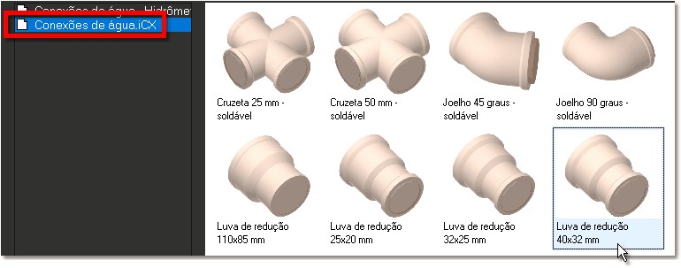3. Na coleção de "Conexões de água", selecione o componente "Luva de redução 40x32 mm" e pressione OK para confirmar;