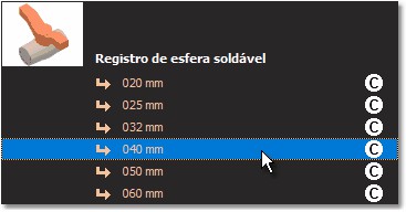 4. No menu, selecione o diâmetro nominal de 40 mm ou o diâmetro utilizado na tubulação onde pretende adicionar o registro.